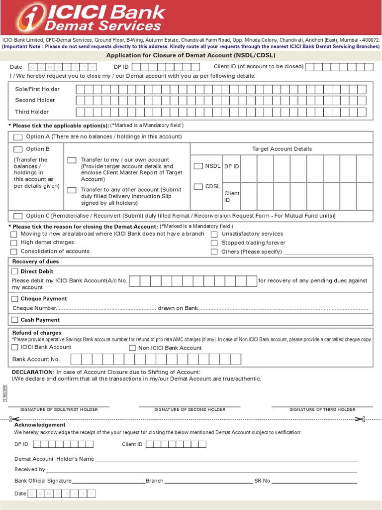 Icici Trading Account Closure Form : Closing your icici bank account involves, collecting and filling up account closure form, returning your passbook, debit card, credit card, cheque book, and submitting address proof and identity proof documents to the bank.